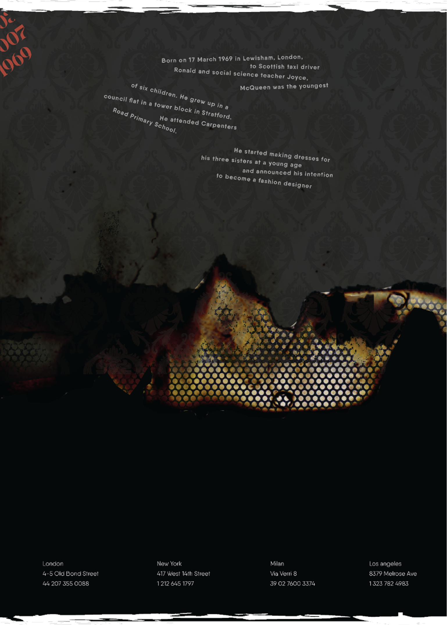Alexander McQueen turned fashion into theatre — dark, beautiful, and technically relentless. This four-panel foldout was designed as a collectible keepsake for Alexander McQueen flagship locations, honoring the Met's landmark Savage Beauty exhibition. Photography, acrylic paint textures, vector elements, and layered typography fold into a single piece — dense with detail, built to reward a closer look. The complexity of the format mirrors the designer it celebrates.